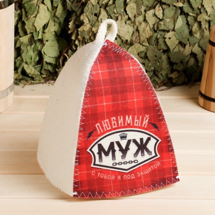 Шапка для бани «Классическая» с термопечатью «Любимый муж (красный фон)»